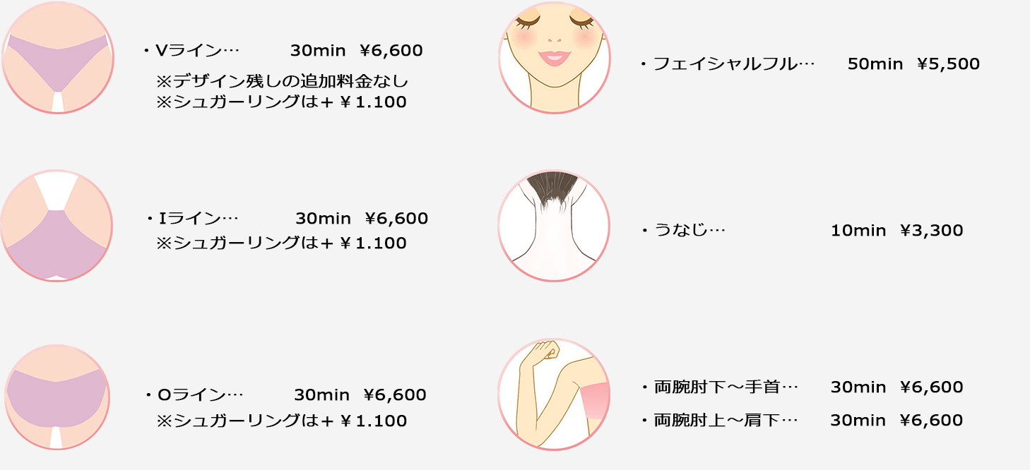 頭皮を除く(VIO・脚・腕・顔・脇など)身体のほとんどの箇所を除去する事が可能です